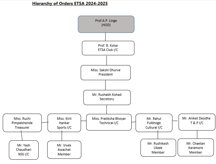 The Dept. of Electronics and Telecommunication Engineering has a student Club known as ‘ETSA’. It stands for ‘Electronics and TelecommunicationStudentsAssociation’. run by students of E & TC Engineering for students of department. The main objective of the ETSA is to provide platform to students to explore their skills and knowledge through curricular and extra-curricular activities in the field of Electronics and Telecommunication Engineering. Through ETSA students organize project competitions, alumni interactions and celebrate days like "Teachers Day" and "Engineers Day".