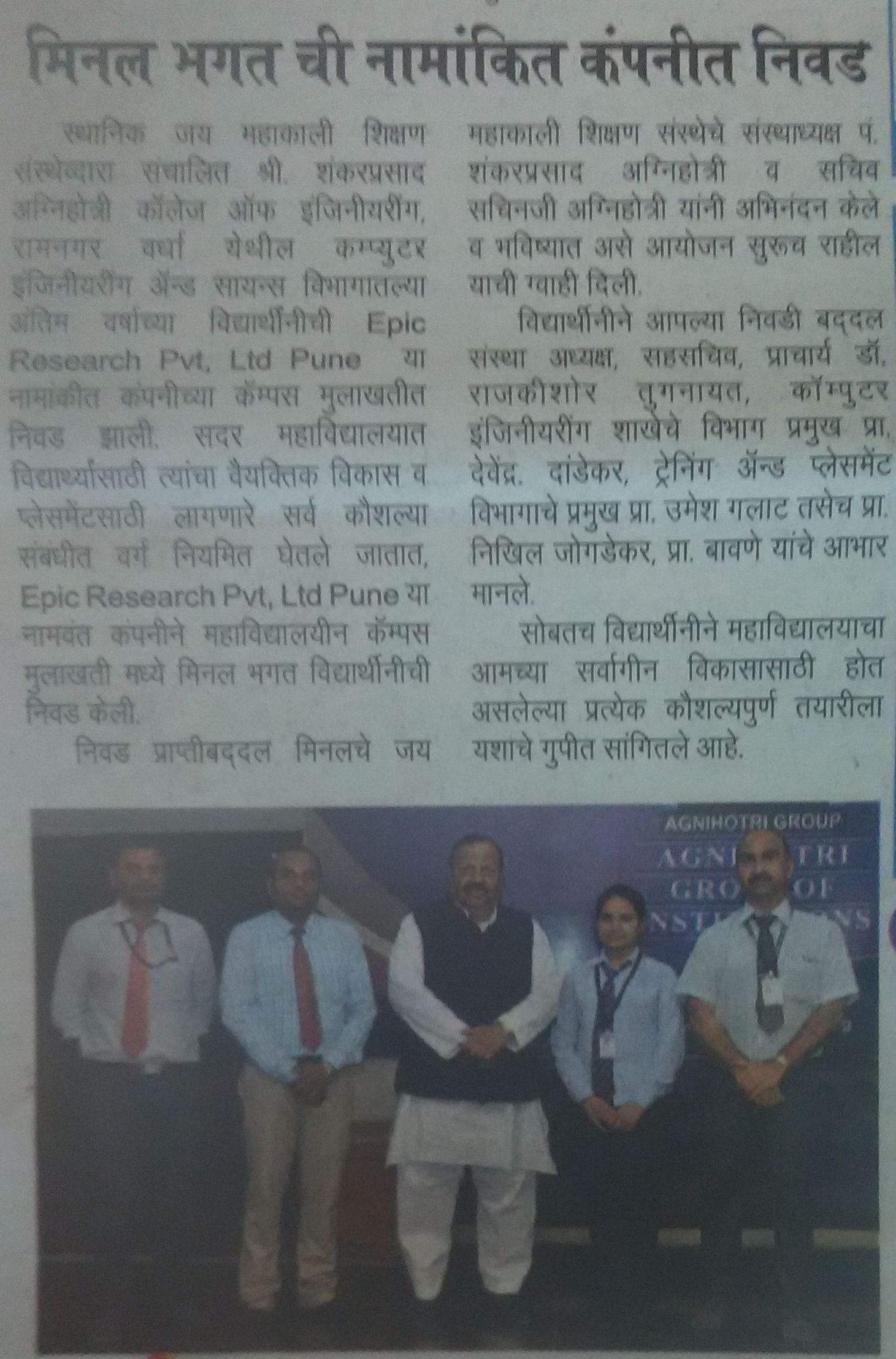 Student select Campus Recruitment CMS pvt.ltd Nagpur
